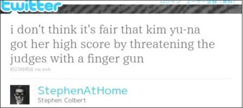 Twitter / Stephen Colbert: i don't think it's fair th ... via kwoutスティーヴンがフィギュア女子なんか見てると思わなかった(こら)ので、ちょっと転載。「高得点してくれないと、お色気爆弾をしかけちゃうわよvばきゅーんvv」なんてもちろん言って…